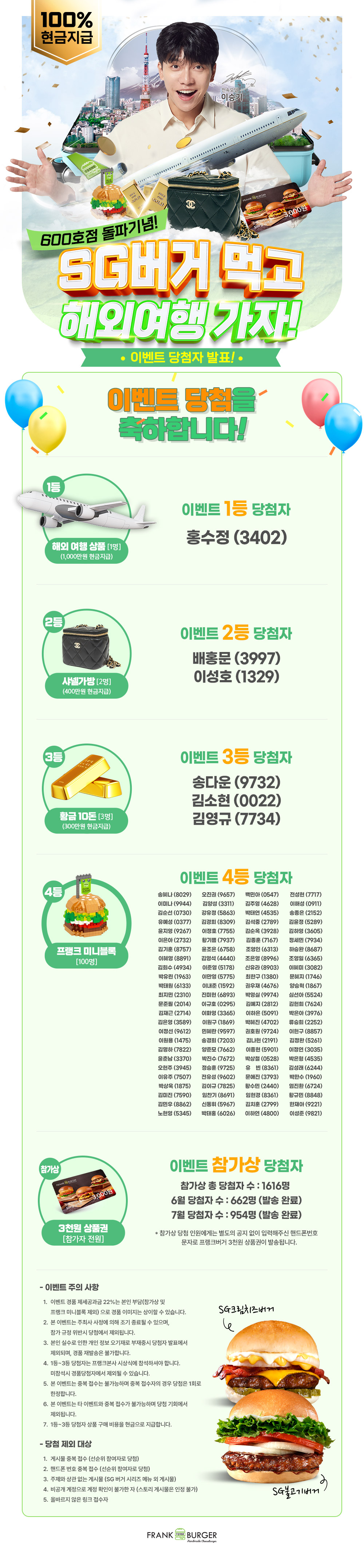 [600호점 돌파 기념 이벤트] SG버거 먹고 해외여행 가자! 당첨자 발표!